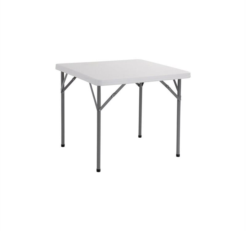 Tavolo quadrato con piano fisso e gambe pieghevoli. Resistente e adatto per uso interno ed esterno. Piano in polietilene e struttura in acciaio verniciato.