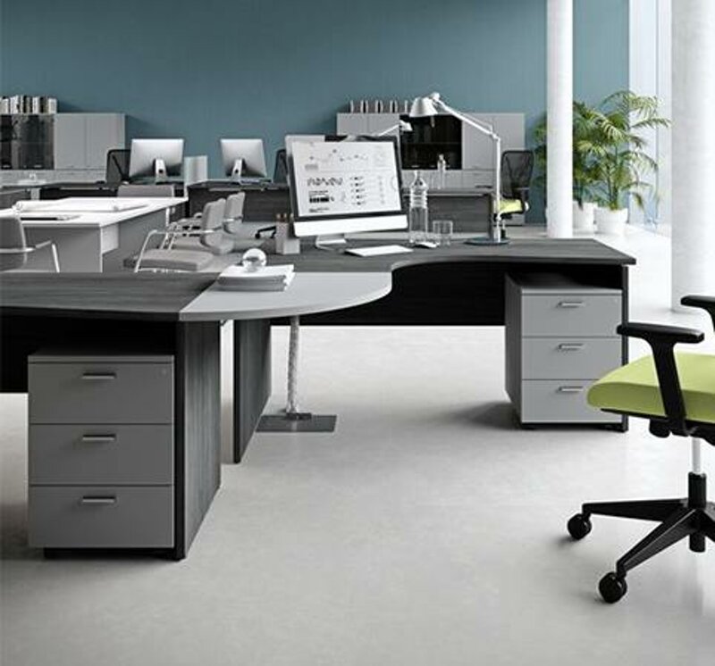 Cassettiera in nobilitato melaminico spessore 18 mm, dotata di ruote piroettanti con carter e doppio battistrada in PVC rigido nero e perno di rotazione in acciaio, serratura a blocco simultaneo di tutti i cassetti con chiave pieghevole antinfortunistica, interni cassetti in agglomerato di legno e scorrevoli su guide metalliche con rullini in nylon, cassetto superiore completo di vassoio portacancelleria asportabile in PVC rigido stampato, maniglie in materiale plastico finitura alluminio satinato.