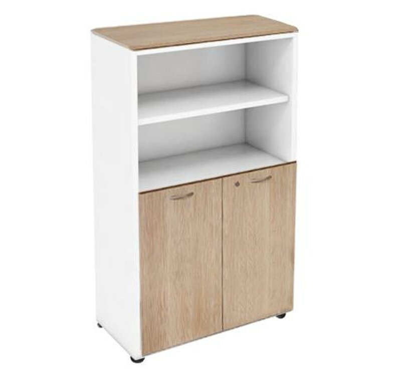 Armadio con 3/4 ripiani interni con parte superiore a giorno e parte inferiore con due ante in legno dotata di serratura. Disponibile in due altezze.