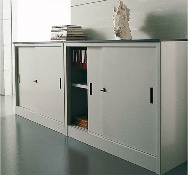 Armadio metallico basso monoblocco ad ante scorrevoli, verniciato, dotato di 1 ripiano interno con serratura di sicurezza.