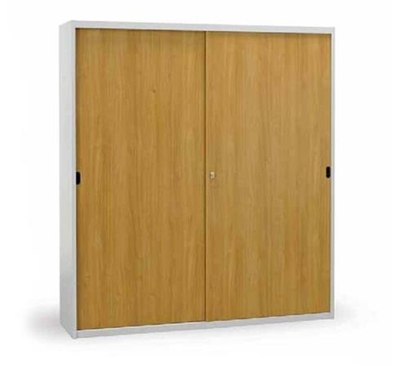Struttura in lamiera d’acciaio con ante in melaminico, a scorrimento dotate di maniglie incassate e serratura.